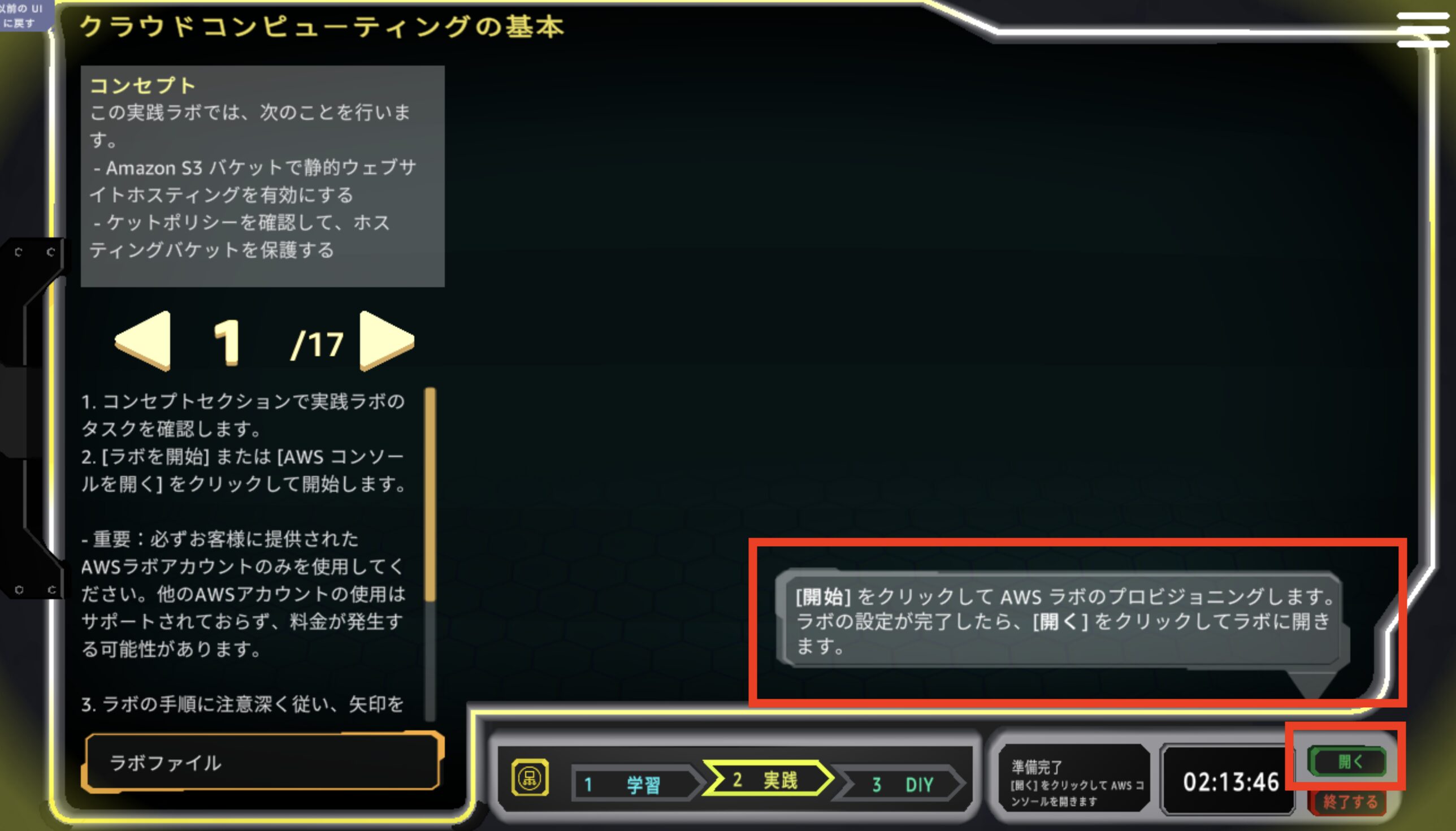 実践パート・DIYパートでは、手順に従い、画面右下の[開く]をクリックすると、ゲーム用に用意されたAWSアカウントのコンソール画面に遷移します。