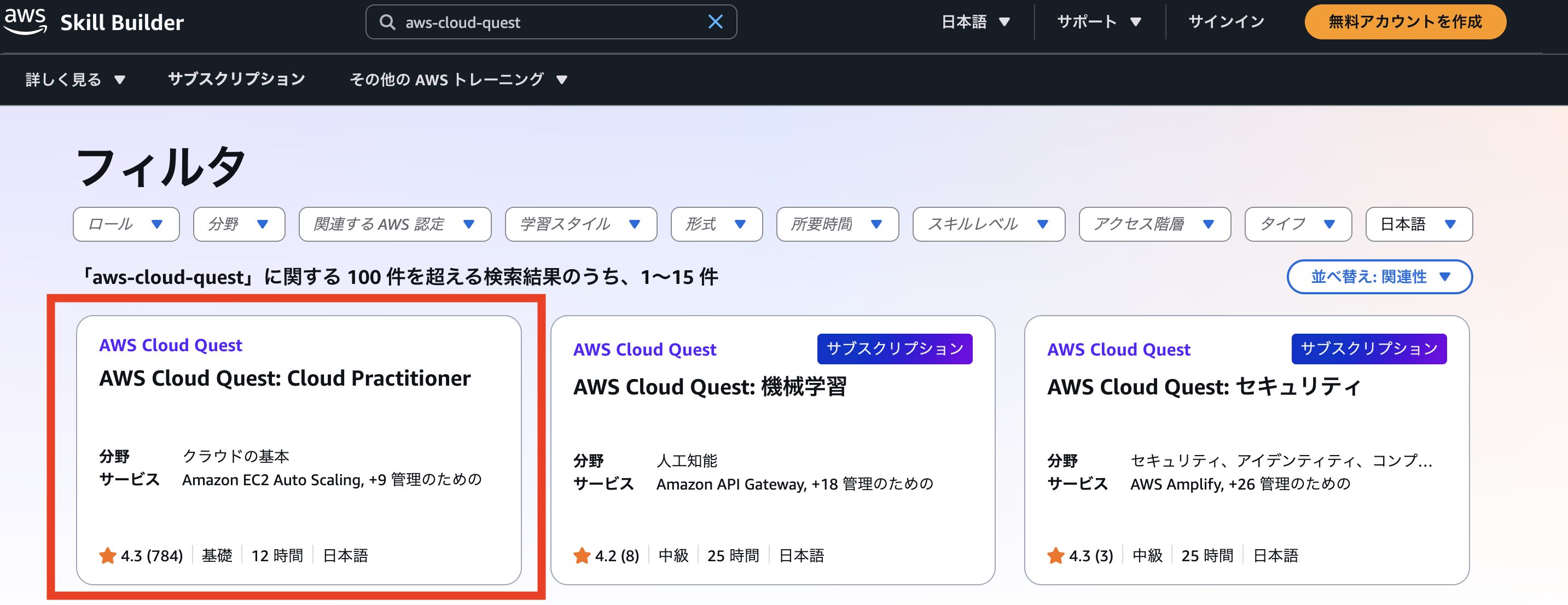 AWS Skill Builderを登録することで、Cloud Quest: Cloud Practitioner(Japanese)を無料で利用することが可能です。