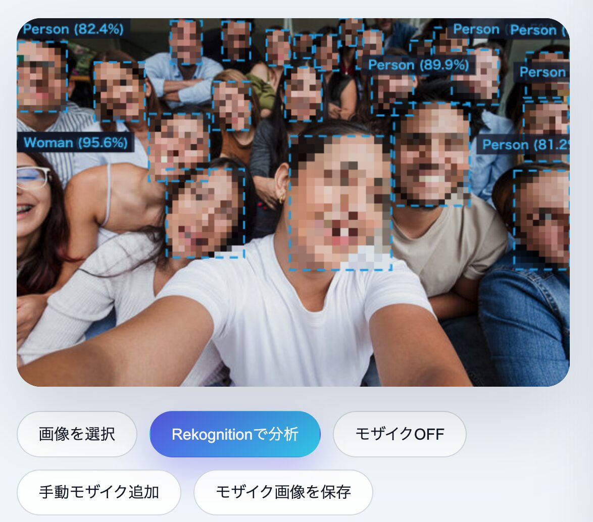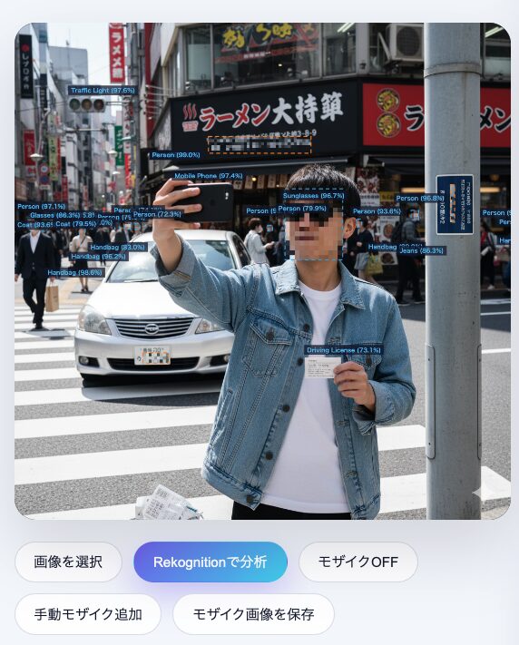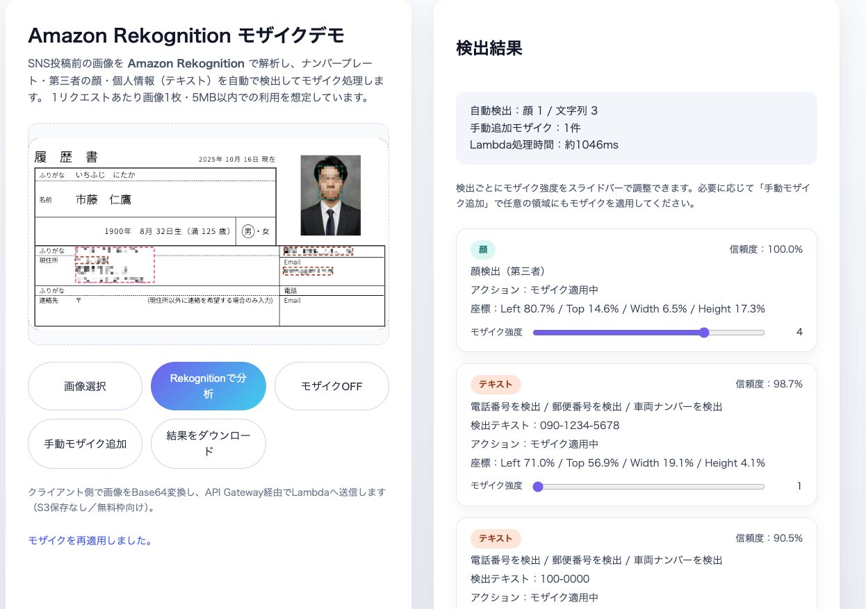 AWS Lambda関数の中には、Amazon Rekognitionを呼び出して、画像から検知した顔や住所などの個人情報をマスキングする(モザイクをかける)コードを記述してあります。