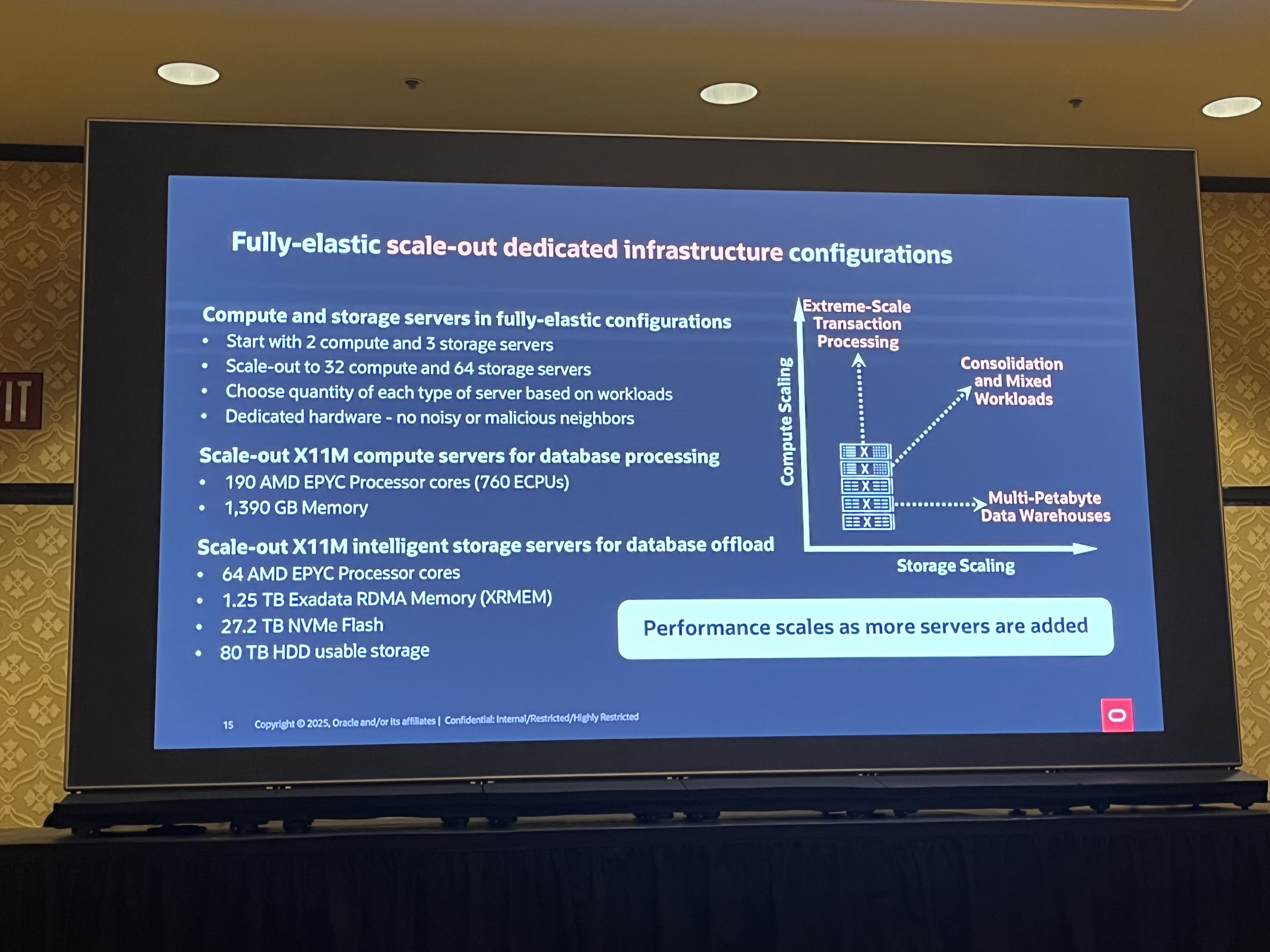 - 高い性能:Exadata X11Mコンピュートサーバーは、データベース処理用に190 AMD EPYCプロセッサコア(760 ECPUs)と1,390 GBのメモリを搭載しています。