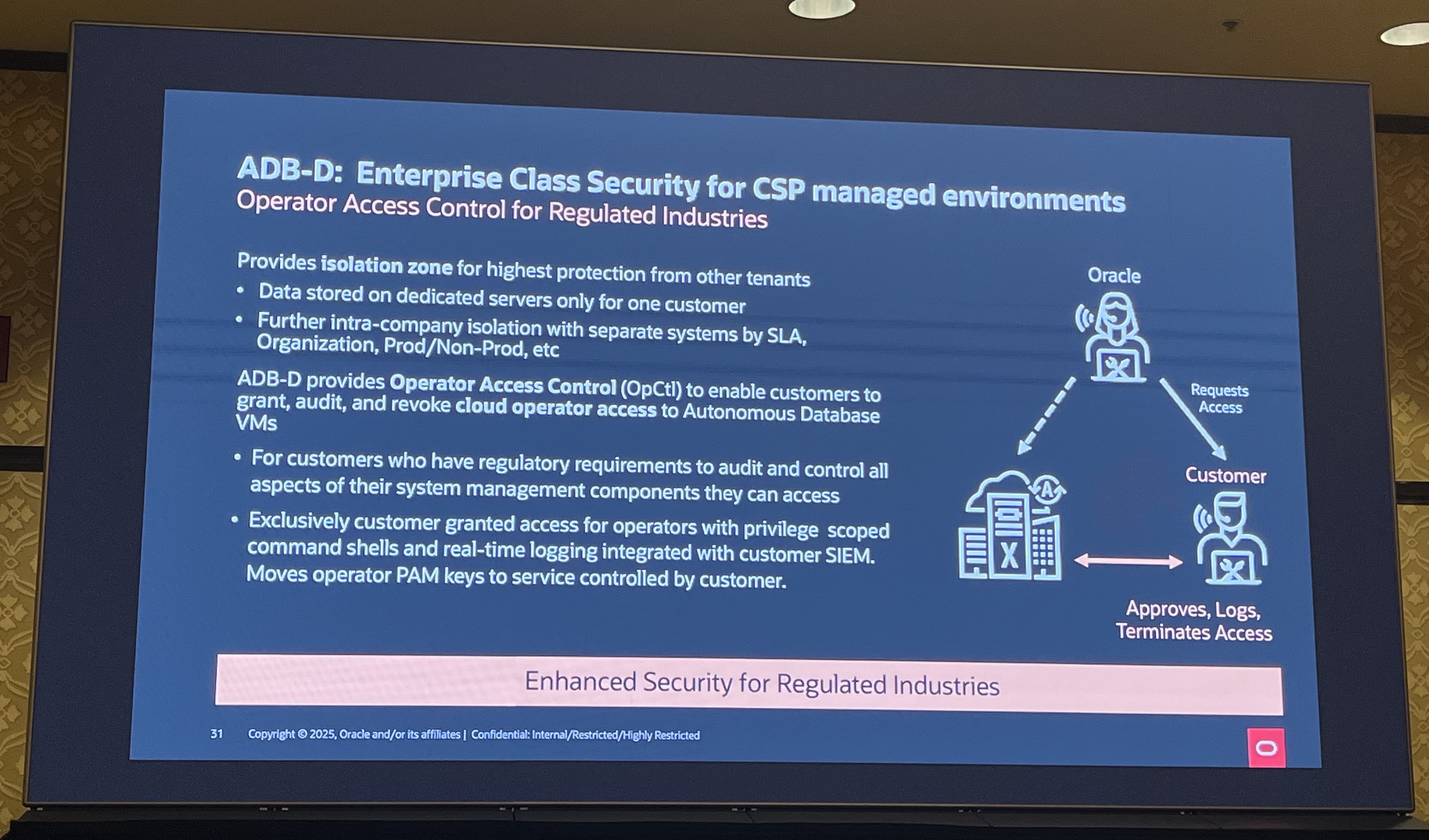- Operator Access Control (OpCtl):高度に規制された業界向けに、クラウドオペレーターによるAutonomous Database VMへのアクセスを顧客が監査、制御、取り消しできる機能を提供します。