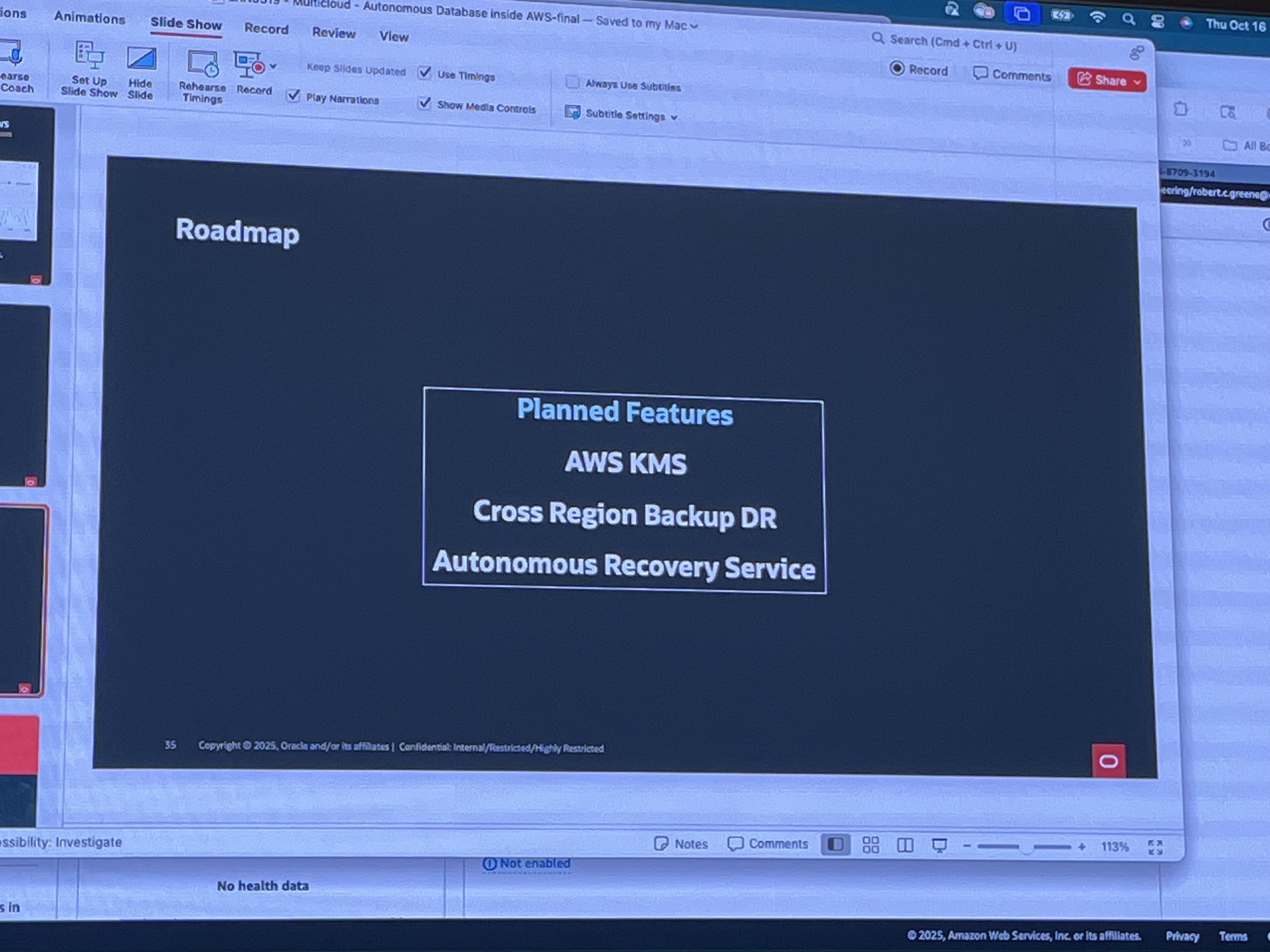 - 今後の計画 (Roadmap):AWS KMSとの統合、クロスリージョンバックアップ、Autonomous Recovery Serviceとの統合などが予定されているとのこと。