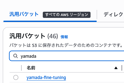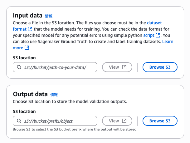 S3にある「train.jsonl」と「output」フォルダをそれぞれ選択します。