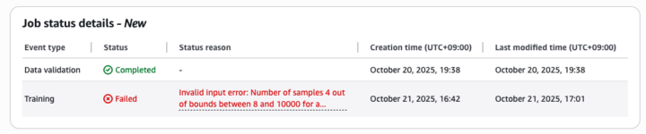 また、「Data validation」はトレーニングジョブを作成してすぐに成功しましたが、「Training」に関してはGPUの割り当てがあるのか開始時間はまちまちです。何度か作成してみましたが、20時間も待ったのはこの日だけだったのであまり考える必要はないかとは思います。Trainingが始まらなくても気長に待ちましょう。