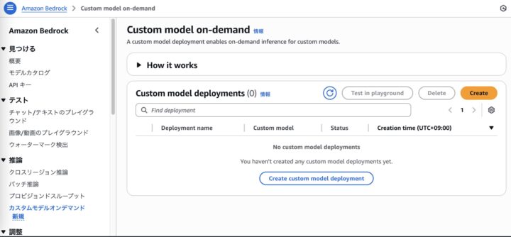 Amazon Bedrockの左のメニューから「カスタムモデルオンデマンド」を選択し、「Create」を選択します。