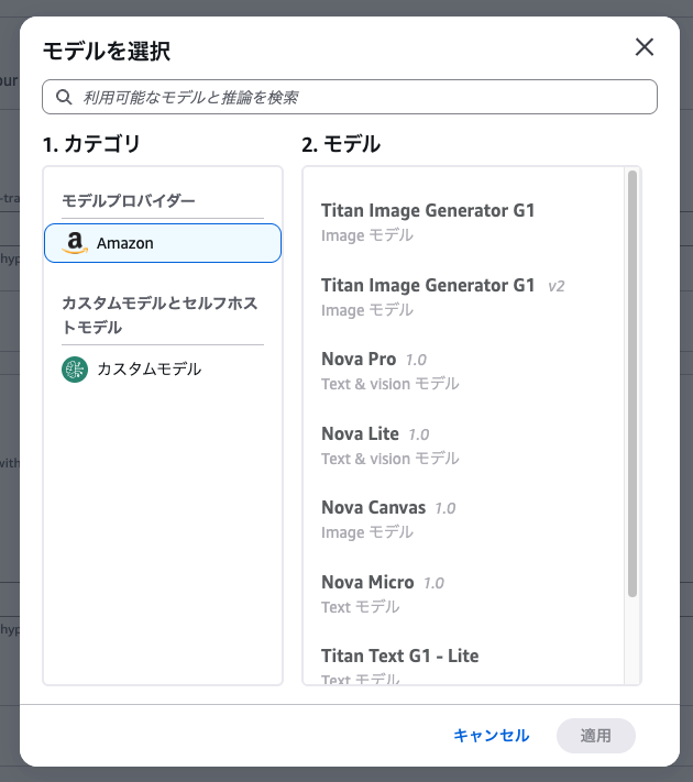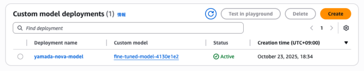 ※執筆時点ではNovaのFine-tuningができるリージョンが限られています。「カスタムモデル」が見当たらない場合はリージョンを確認してください。