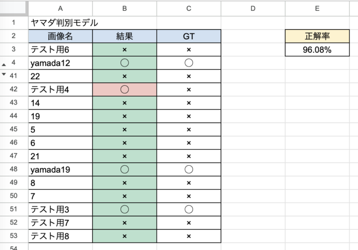 曖昧な指示になってしまっていた判別の部分を「ヤマダ」かそれ以外かを判別するだけに絞り、ヤマダ以外のトレーニングデータもかなり増やしました!