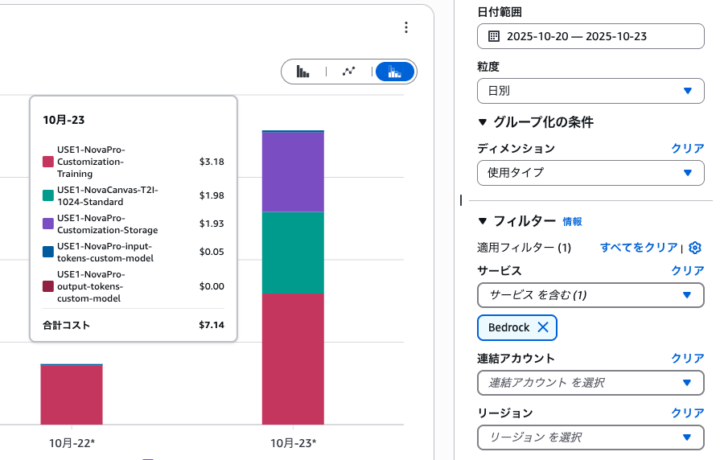 大体トレーニング料金で$3.2ほど、モデルの保存に$1.93かかっていることが分かります。Fine-tuningではトレーニング時間によって課金が発生することもありますが、Amazon Bedrockのトレーニング料金はテキスト生成モデルの場合はトークン数に基づいて計算されます。