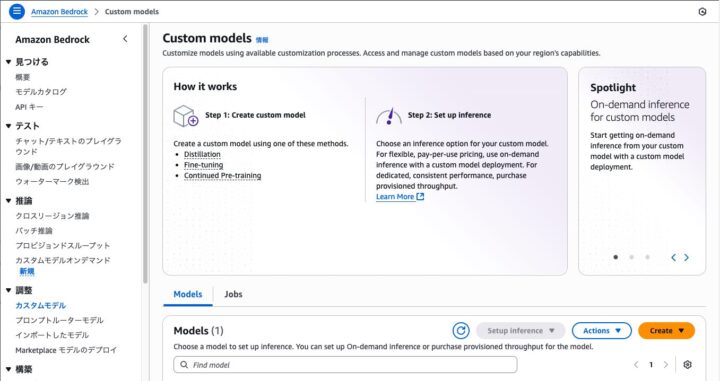 まずはAmazon Bedrockのページへ移動し、左のメニューから「カスタムモデル」を選択します