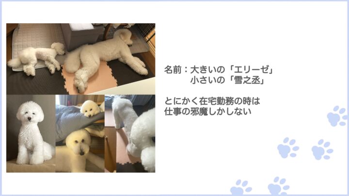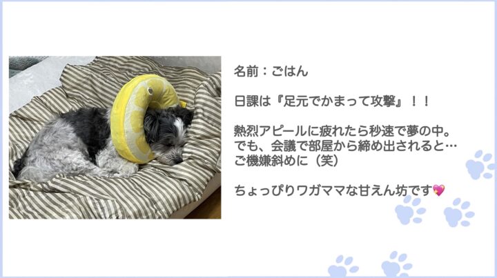 余談ですが、エリーゼ&雪之丞・ハニ・ごはんは、オンラインミーティングで各飼い主のアイレットメンバーの画面に映り込んでいたのを実際に見たことがあります(笑)。