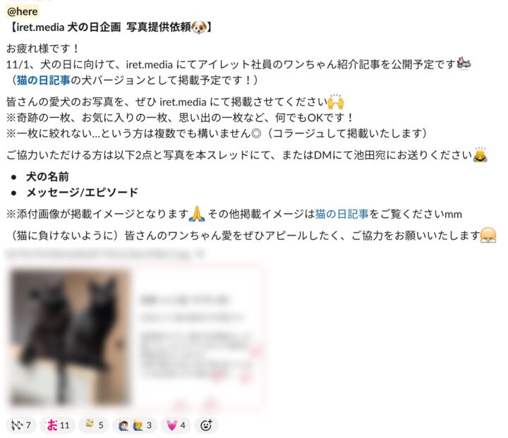 冒頭に述べた通り、アイレットの Slack には犬好き社員たちが集まるチャンネル「chat-dog」があり、写真の共有や相談まで幅広く社員同士の交流が行なわれています。