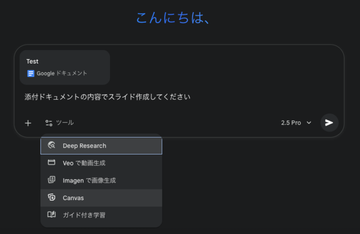 - ツールからCanvas選択して「添付のドキュメントの内容でスライド資料を作成してください」 ってお願いする!
