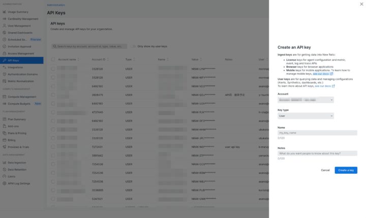 補足:UIでは作成時以外は値を再表示できない仕様。NerdGraphなら既存/新規キーの取得が可能