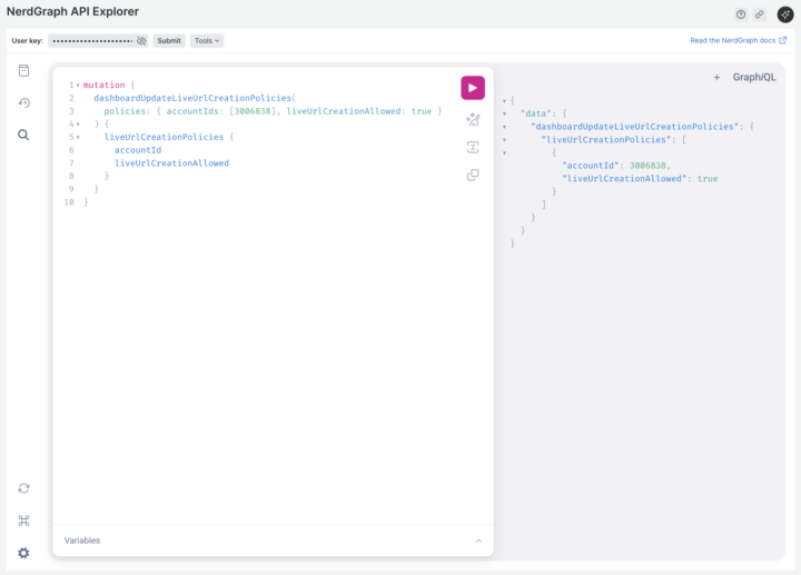 mutation { dashboardUpdateLiveUrlCreationPolicies( policies: {accountIds: [YOUR_ACCOUNT_ID], liveUrlCreationAllowed: true} ) { liveUrlCreationPolicies { accountId liveUrlCreationAllowed } } }実行結果 ↓