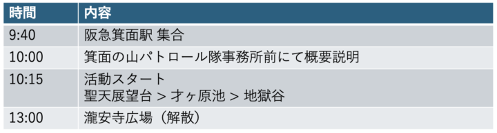 今回は、「箕面の山パトロール隊」が主催する環境保全イベントに