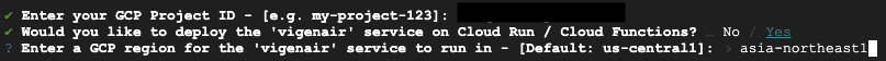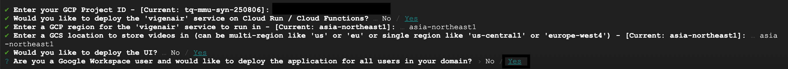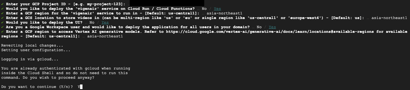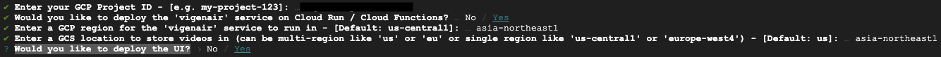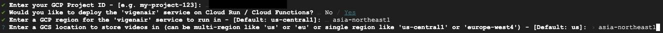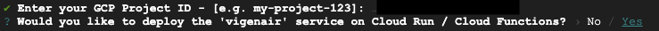 ViGenAiRをCloud Run / Cloud Functionsにデプロイしますか?という問いには「Yes」と回答します。