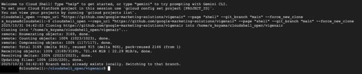 Cloud Shellのターミナル画面に遷移して、しばらくするとクローンが完了した旨のメッセージが出ます。