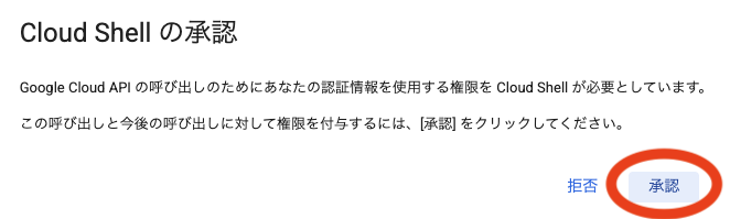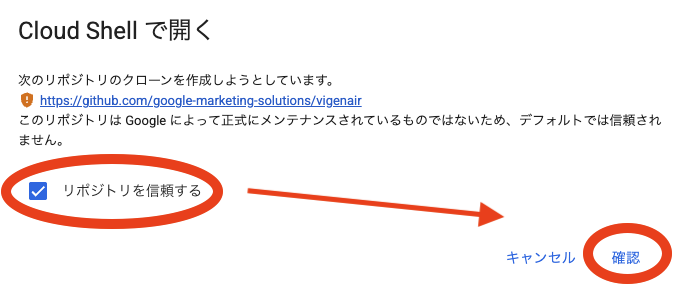 すると、Cloud Shell上にリポジトリのクローンを作ろうとするので、許可していきます。