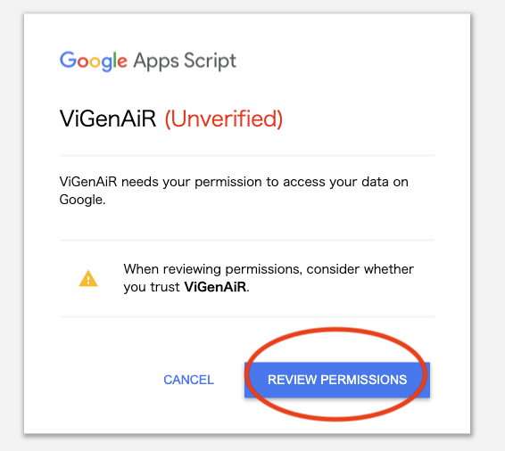 すると、以下のような画面が出るので「REVIEW PERMISSIONS」を押下します。