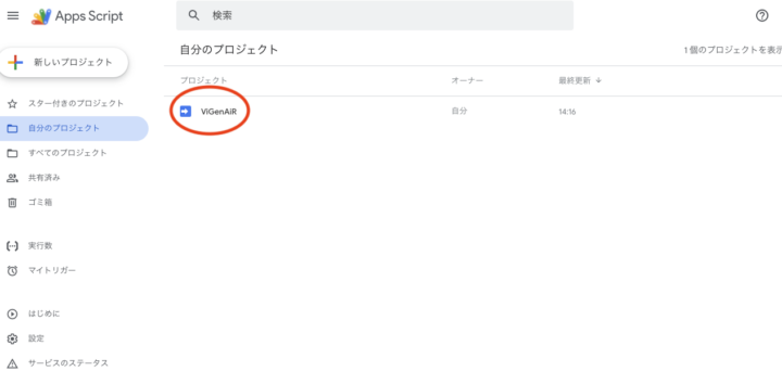 「https://script.google.com/home/my」にアクセスして、自分のプロジェクトに「ViGenAiR」の項目があることを確認します。