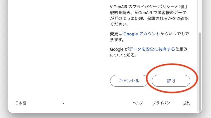 確認画面が出るので、下にスクロールして「許可」を押下します。