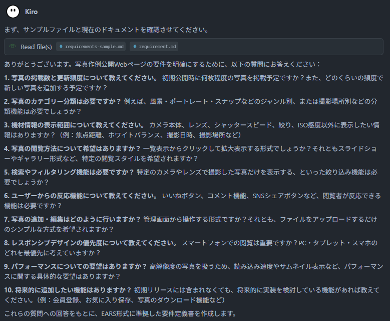 下図のように、AIから要件定義のための質問を投げてもらい、それに答える形で仕様を定義していきます。