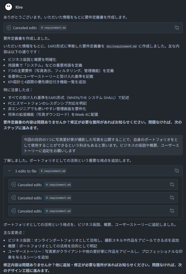 回答を基に要件定義書が作成されます。作成された要件に対して修正したい部分があれば追加で指摘することで要件定義がブラッシュアップされます。