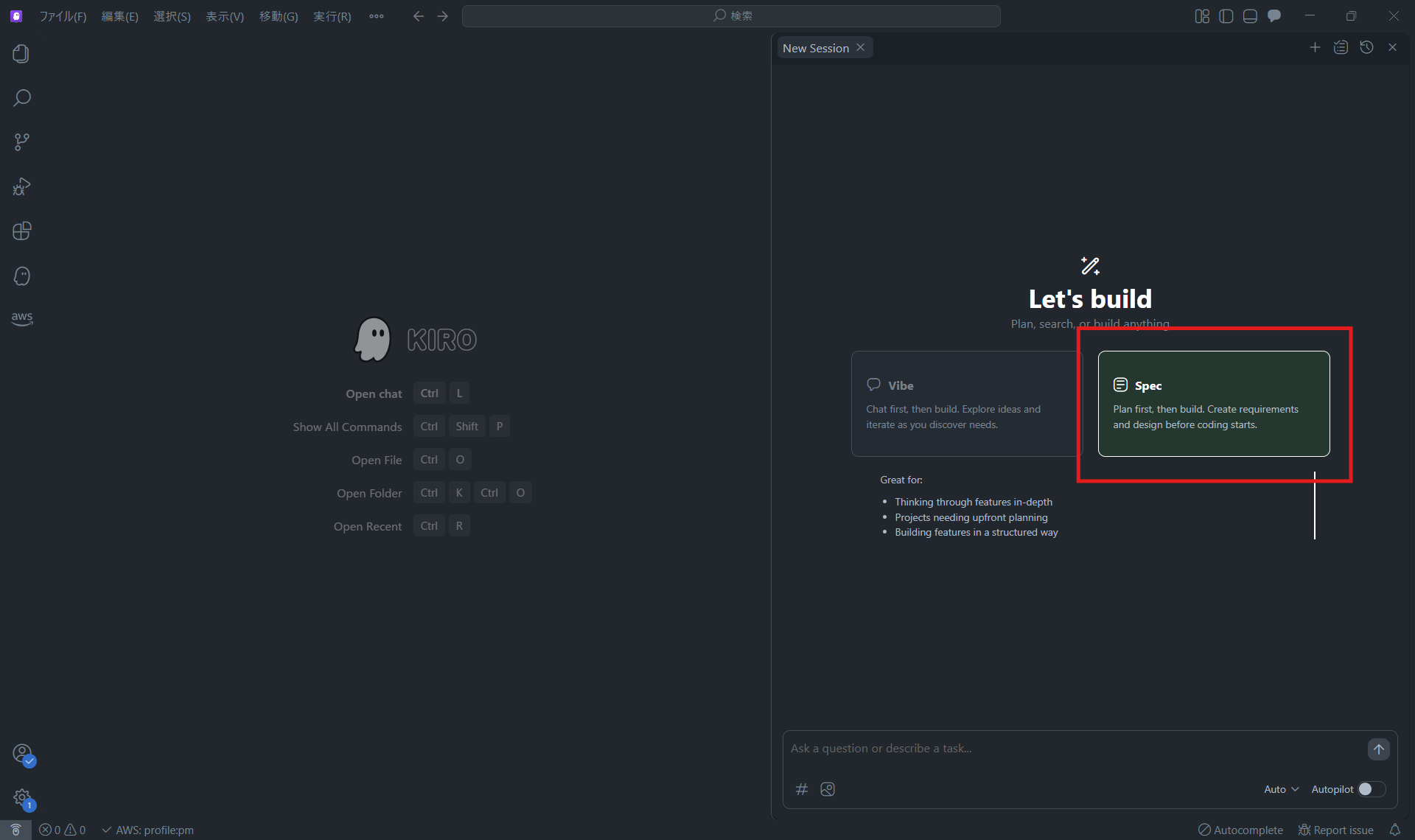 インストールが完了して起動すると、VSCodeに似た画面が現れます。 VSCodeがベースになっているため、プラグインなどはKiroにも一部流用することもできます。
