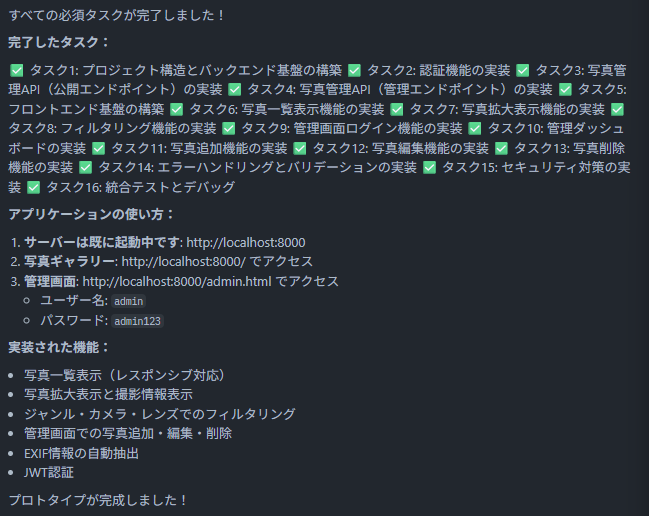 設計書の作成が完了するとタスクリストが作成されます。実装に向けて段階的に構築できるよう手順が記載されています。次のフェーズでこの生成されたタスクリストを基にコーディングしたいと思います。