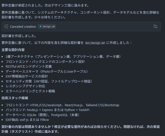 要件定義について承認すると、システムのアーキテクチャ、コンポーネント設計、データモデルなどを含む詳細な設計書が作成されます。特に指定はしていないのですが、フロントエンドのコンポーネント一覧、REST API、データベーススキーマ、セキュリティ対策、テスト戦略まで設計してくれます!ここで実装に向けた技術選定も行われます。