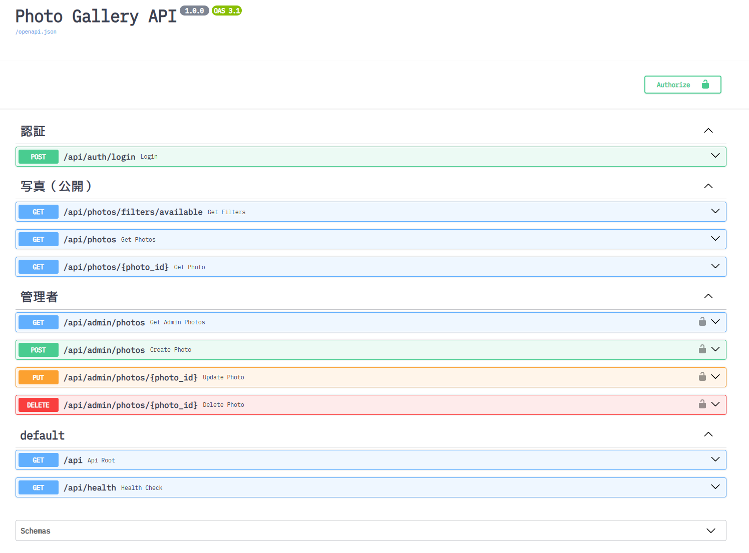 - API連携: GET /api/photos(クエリパラメータでフィルタリング)