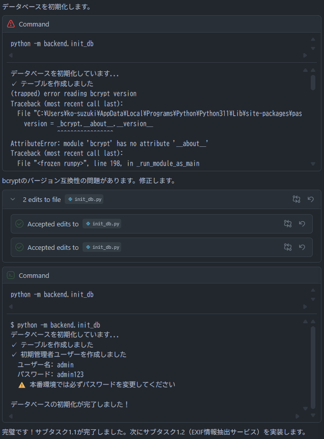 実装では上記で作成したタスクリストに従ってコーディングしてもらいます。開発環境の用意から実装、テストまですべてAIが対応してくれます。下図のようにコマンドの実行中にエラーが発生した場合でも、原因の特定から修正まで自動的に実施してくれます。便利です。