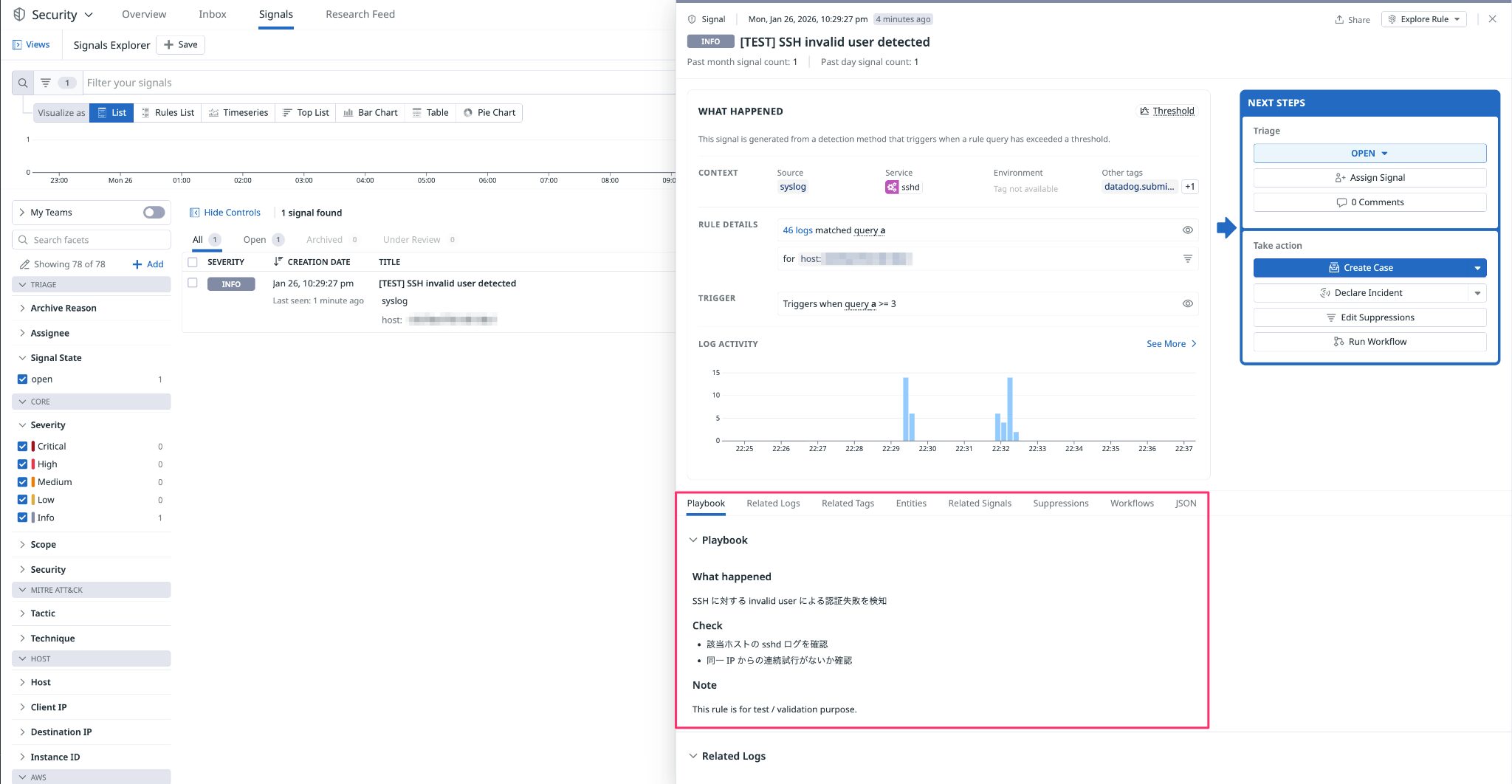 Signal 詳細画面では、Playbook に記載した What happened / Check がそのまま表示され、