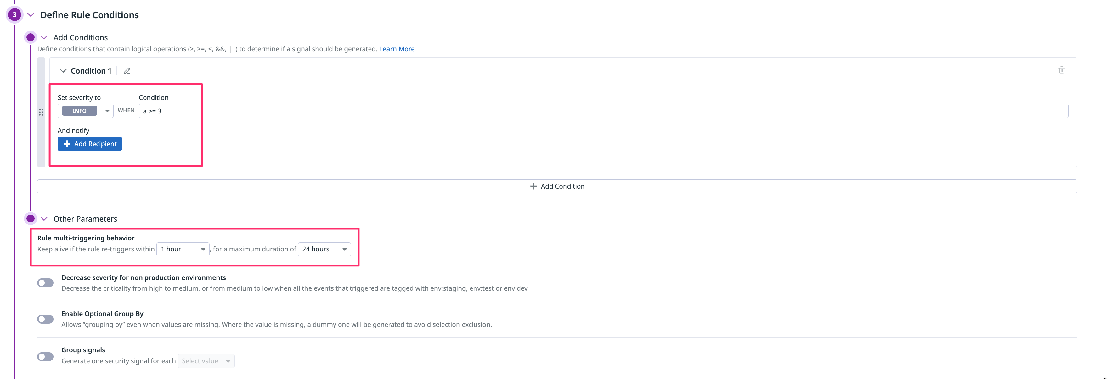 検証段階では Severity を INFO にし、再トリガー抑制(multi-triggering behavior)も「まとめる」方向に寄せます。