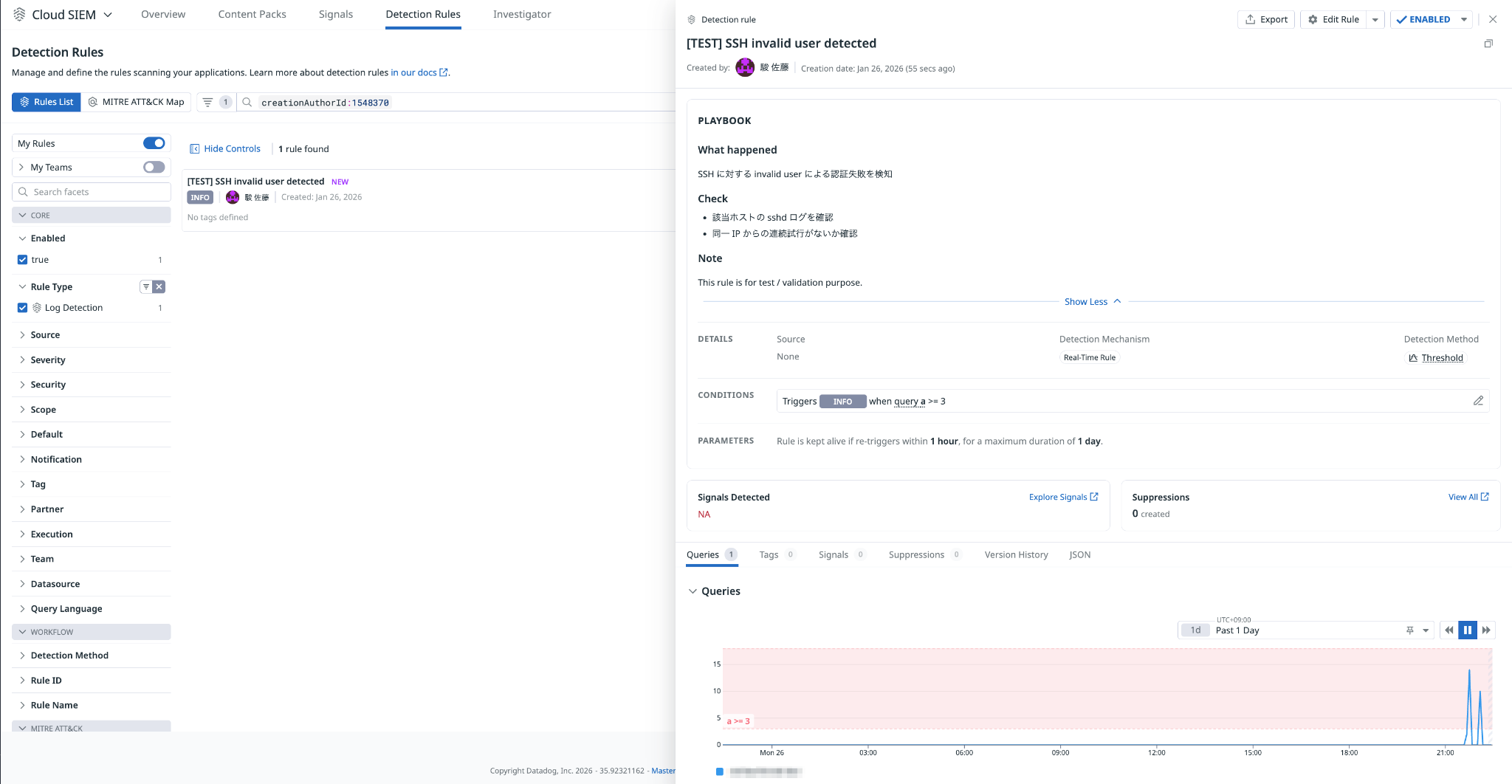 SSH invalid user を検知する Detection Rule の作成