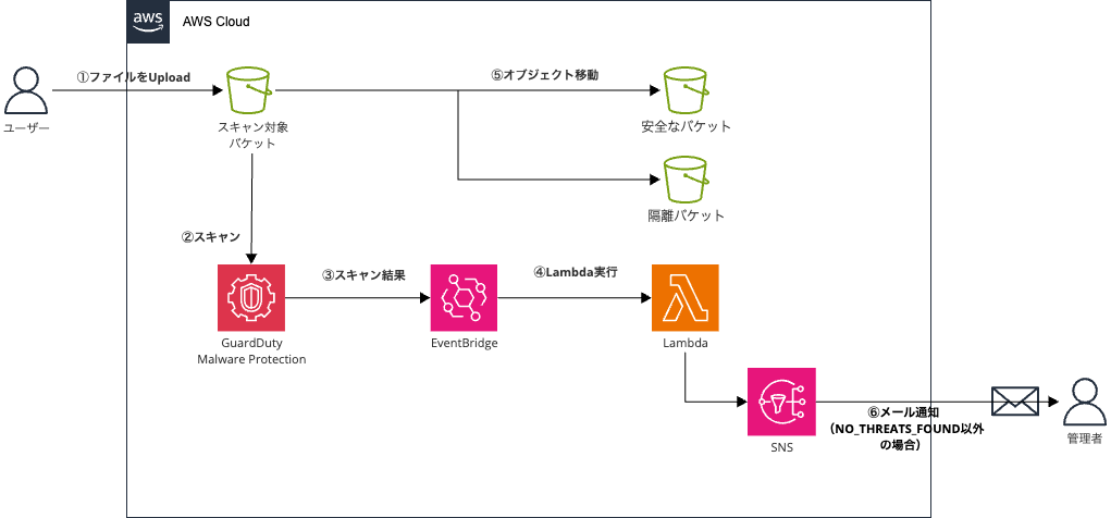 - 実行される Lambda 関数では、スキャン結果に基づいて、オブジェクトを移動します。
