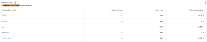 APMの slowest transactions を確認すると、home の平均実行時間は約40秒となっており、