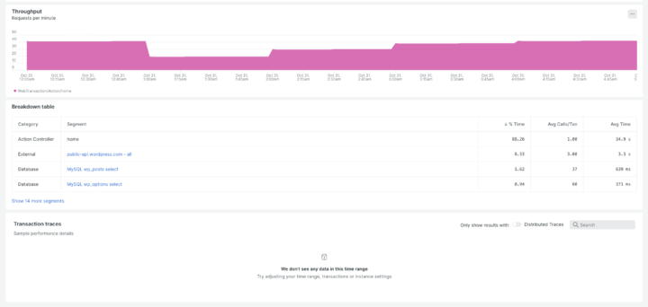 さらに、home トランザクションの内訳を見ると、処理時間の約88%が PHP アプリケーション本体に集中しており、