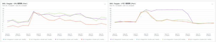 FROM K8sNodeSample SELECT average(cpuUsedCores), average(memoryUsedBytes) WHERE clusterName = ‘iret.media’ SINCE ‘2025-10-31 00:00:00 JST’ UNTIL ‘2025-10-31 05:00:00 JST'
