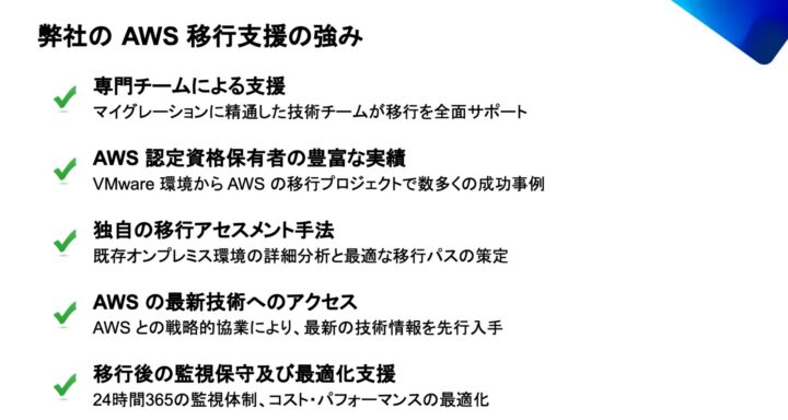また、アイレットならではの強みとして、既存オンプレミス環境の詳細な分析によって最適な移行パスが策定される点や、移行から運用までプロセス全体を通じて伴走型支援が実施される点を挙げました。