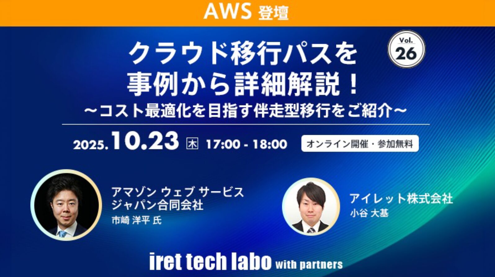 第26回となる今回は「クラウド移行パスを事例から詳細解説!〜コスト最適化を目指す伴走型移行をご紹介〜」と題し、アマゾン ウェブ サービス ジャパン合同会社の市崎 洋平様とアイレット株式会社の小谷 大基が講演を行ないました。