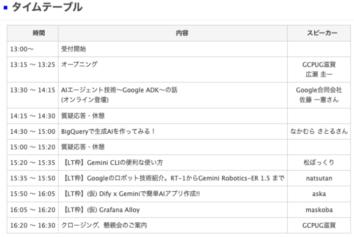 当日のタイムスケジュールは以下のように、ADKからBigQuery、Gemini Robotics、Grafana Alloyと幅広いテーマで実施されました。