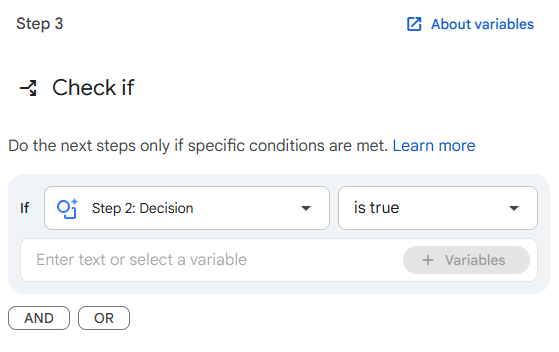 Step 2 の AI の判断結果(True / False)に基づいて、処理を分岐させます。