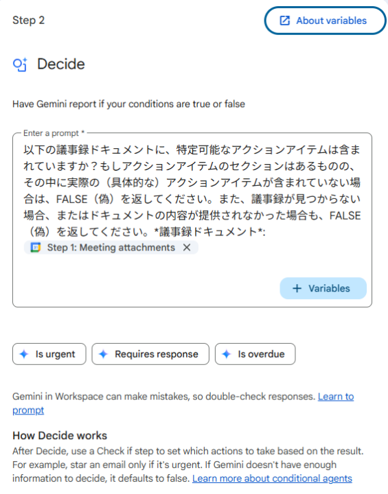 - Step 2: Decide (AI が議事録にアクションアイテムがあるか「判断」する)