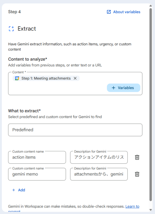 *議事録ドキュメント*: {{Step 1: Meeting attachments}}{{Step 1: Meeting attachments}} には、Step 1 でトリガーとなった会議の議事録ドキュメント(Gemini メモ)が自動的に入ります。