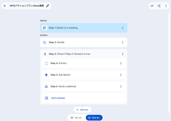目的: Google Meet で Gemini が生成した議事録(メモ)を AI が読み込み、「アクションアイテム」が書かれていれば、その内容とメモのURLを Slack の特定チャンネルに自動投稿する。