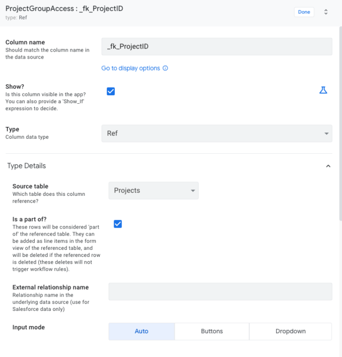 これらの列のTypeを [Ref] に変更し、[Source table] で参照先のテーブル(例: _fk_ProjectID なら Projectsテーブル)を正しく選択します。