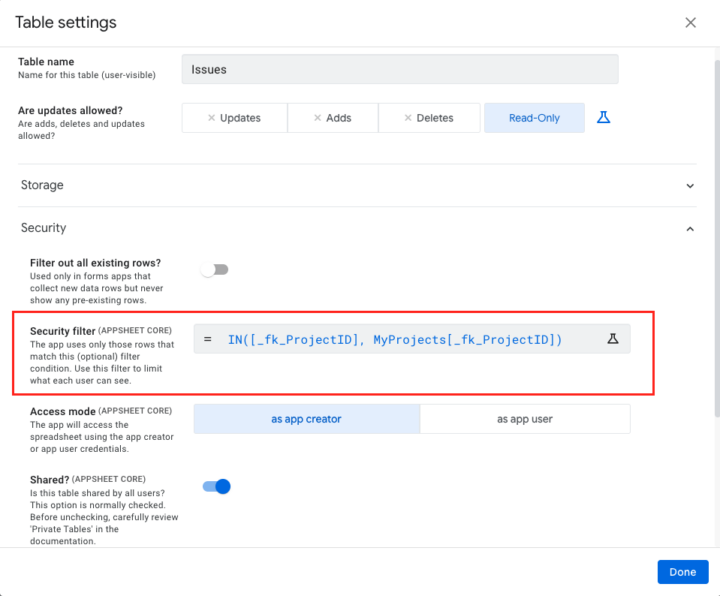 MyProjects[_fk_ProjectID]:ステップ3で作成したスライスMyProjectsに含まれる_fk_ProjectIDのリスト(つまり、ログインユーザーがアクセス権を持つプロジェクトIDのリスト)を取得します。IN([_fk_ProjectID], ... ):Issuesテーブルの_fk_ProjectIDが、先ほどの「アクセス権を持つプロジェクトIDリスト」に含まれている(IN)課題(Issue)だけを表示するようにフィルタリングします。