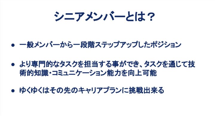 シニアメンバーとはアイレット独自のポジションで、一般メンバーから一段ステップアップしたポジションです。