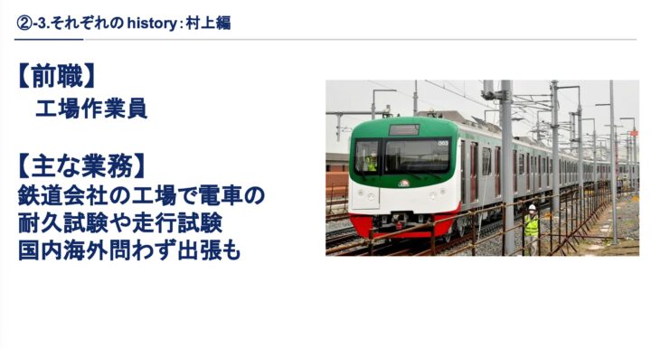 - 主な業務: 鉄道会社の工場で電車の耐久試験や走行試験、国内外への出張業務など